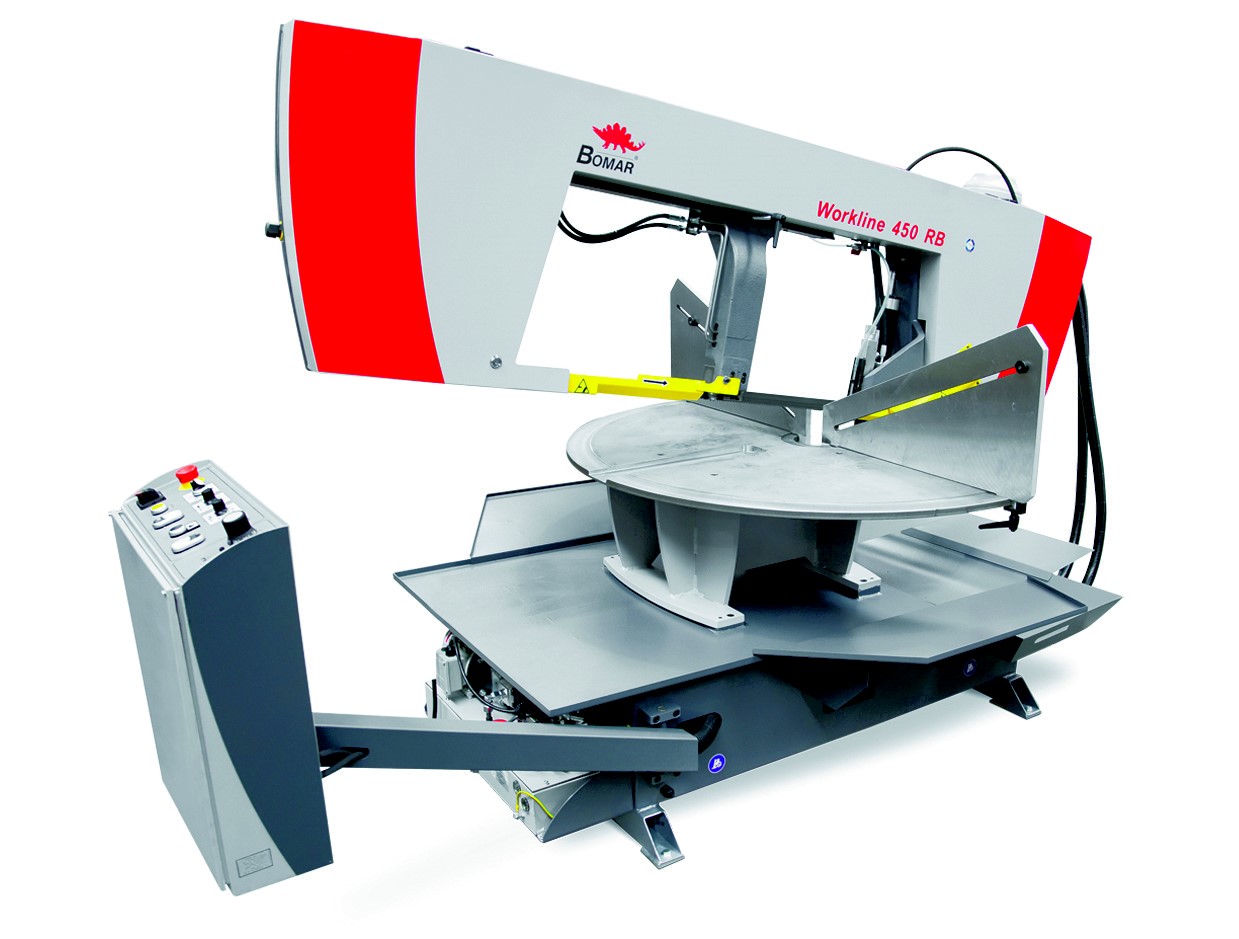 Speziell zur Trennung von Rohrbögen mit einem Maximaldurchmesser von 450 mm wurde diese Rohbogenbandsäge entwickelt. Rohrbögen mit Krümmungen von 45 bis maximal 180 können mit dieser Säge effizient getrennt werden. Sie finden vornehmlich Anwendung im Schiffsbau und in der Offshore-Industrie. Die Sägen der Linie Workline sind prinzipiell mit einem Schwenklager ausgestattet und problemlos in Fertigungsstraßen integrierbar. Sie verfügen über eine Antriebsleistung von 3,0 kW sowie über eine stufenlose Bandgeschwindigkeit von 20 bis 120 m/min mittels Frequenzumrichter. Synchron zur Bandgeschwindigkeit wird eine Spänebürste angetrieben. Die Abmessungen der Workline 450 RB betragen 1.070 x 2.500 x 1.450 mm (LxBxH).