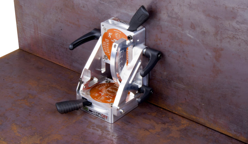 Komplettiert wird das neue Portfolio mit dem Set TMA 300, einem variablen Schweißwinkel. Als Basis dienen zwei TMC 300, die über zwei Winkelseitenplatten miteinander verbunden sind, die sich stufenlos von 0 bis 90 Grad verstellen lassen. Die Scherkraft des Schweißwinkels beträgt auf 6 Millimeter starkem Material 100 Kilogramm. Auch der TMA ist bis 60 Grad Celsius hitzebeständig und sein patentiertes Magnetfeld ermöglicht es, die Schweißnaht bis zu 15 Millimeter an den Magnetkörper heranzuführen. Damit eignet sich der TMA 300, um schwere Werkstücke im Schiffs-, Werkzeug- und Formenbau in unterschiedlichen Winkeln zusammen zu schweißen.