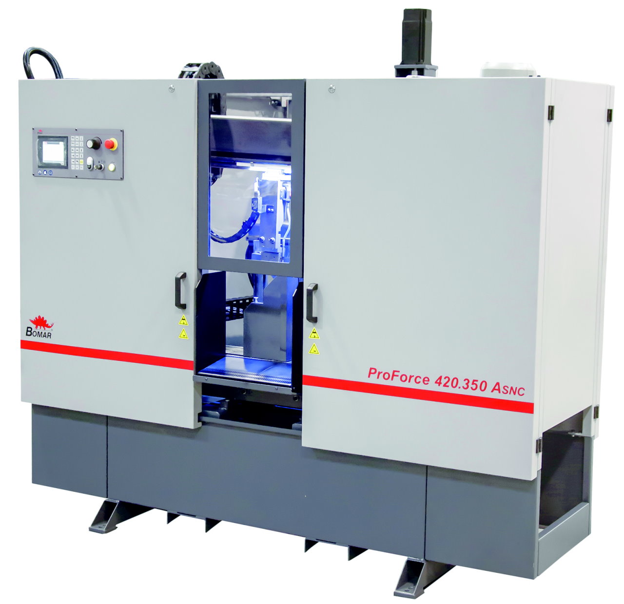 Mit der automatischen, CNC-gesteuerten Hochleistungs-Produktionsbandsäge ProForce 420.350 ASNC in Zwei-Säulen-Ausführung präsentiert BOMAR eine weitere neue Produktreihe in vollverkleideter Ausführung. Der Einsatz der Polymer-Beton-Technologie in der Maschinenausführung führt zu einer deutlichen Vibrationsdämpfung in Sägerahmen, Säulen und Unterbau der Maschine. Der Schnittvorschub erfolgt über zwei Kugelgewindespindeln und Servoantrieb. Weiterhin verfügt der Sägeautomat über eine automatische Schnittdruckregulierung zur Anpassung an die Materialform und den daraus resultierenden Schnittkanal.