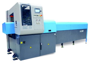 Die neue Hochleistungs-Kreissäge ExactCut TAC 75 der T-Serie in Säulenausführung und Vollverkleidung ermöglicht dem Anwender einen schnellen, einfachen Einstieg in die Welt der Highclass Serienproduktion. Der Sägekopf wird auf spindelfrei vorgespannten Linearführungen und einer hochpräzisen Kugelgewindespindel mit groß dimensioniertem Servoantrieb bewegt. Die Steuerung ist mit einem modernen Touch-Display ausgestattet. Sie führt den Bediener schnell und mittels des intuitiven Dialogsystems leicht durch alle Einstellungen. Um nachstehende Bearbeitungen wie Sortier-, Bestückungs- oder Zerspanungsprozesse an die Sägeanlage anzubinden, wurde in Zusammenarbeit mit Fanuc ein Roboter gestütztes Zuführsystem entwickelt.