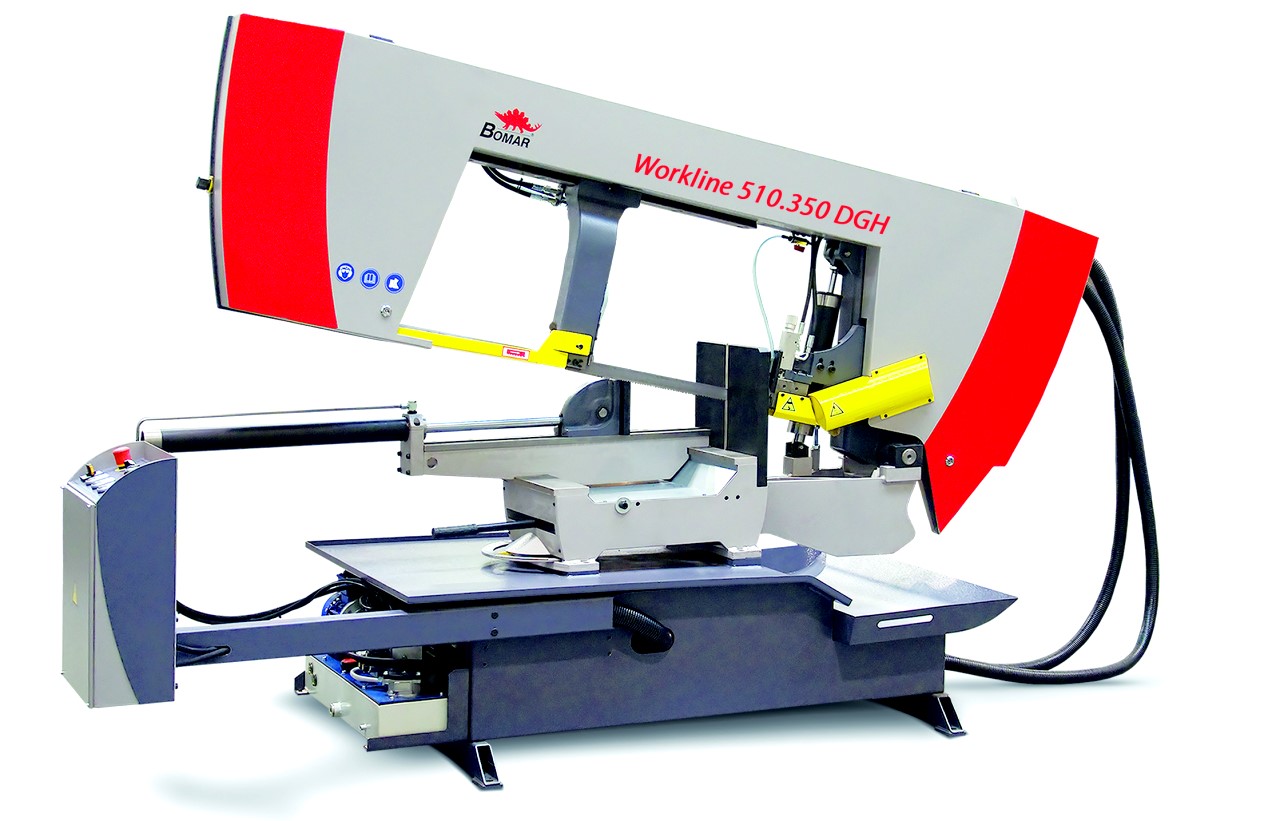 Brünn / Witten, Mai 2019 Im Programm von BOMAR, Spezialist für voll- und halbautomatische Sägen findet sich auch die halbautomatische Doppelgehrungsbandsäge Workline 510.350 DGH. Sie ist ideal für den Einsatz in der Produktion und Stückfertigung im Stahlbau. Es lassen sich Rohre bis zu einem Durchmesser von 350 mm sowie Vierkantprofile von maximal 510 x 350 mm und 350 x 350 mm trennen, bei Vollmaterial maximal 250 mm im Durchmesser bzw. 250 x 250 mm. Auch Bündel mit den Maßen 510 x 175 mm können mit-tels eines optional erhältlichen Bündelspanners hydraulisch gespannt und gesägt werden. Außerdem lassen sich Gehrungsschnitte von 45 rechts, 45 links, 60 rechts und 60 links durchführen. Das vielfältige Zubehör und variable Hand-ling verschaffen der Säge eine große Flexibilität und ermöglichen es, die Anlage kundenspezifisch zu konfigurieren.