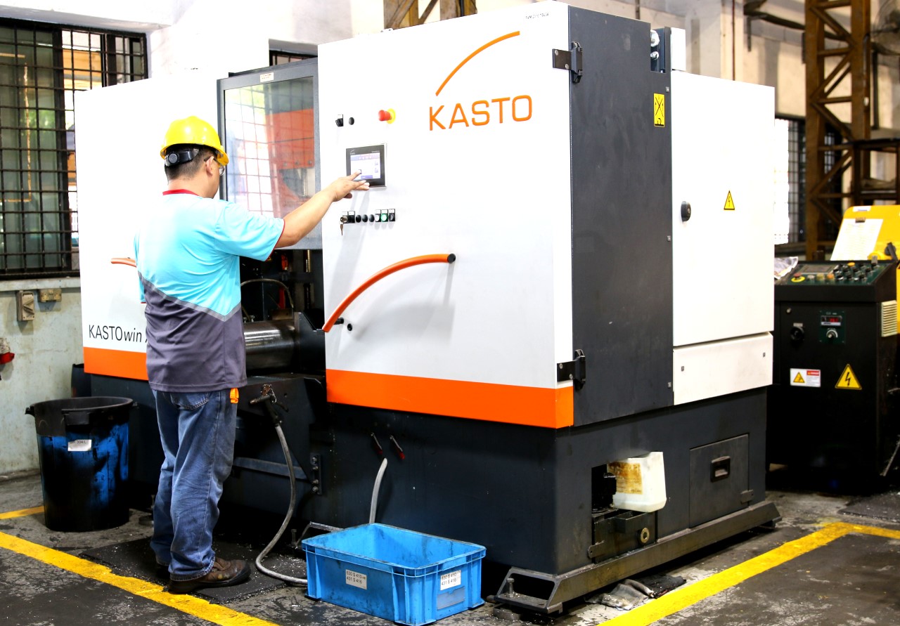 Dass KASTO künftig mit einer eigenen Tochtergesellschaft hier vor Ort sein würde, war für uns letztlich das entscheidende Kaufargument, erklärt Lim. Sin Ghee Huat entschied sich für die vollautomatische Bandsäge KASTOwin A 4.6: Die Maschine bietet eine flexible, universelle Lösung zum Serien- und Produktionssägen von Vollmaterialien, Rohren und Profilen mit einer umfangreichen Standardausstattung. Sie ist zur Bearbeitung von verschiedenen Stählen geeignet und bietet eine hohe Zerspanungsleistung bei geringem Material- und Stromverbrauch. Unser Unternehmen legt großen Wert auf Energieeffizienz. Auch in diesem Punkt hat uns die KASTOwin mit ihrem frequenzgeregelten Antrieb und dem kompakten Hydraulikaggregat durchweg überzeugt, erläutert Lim.