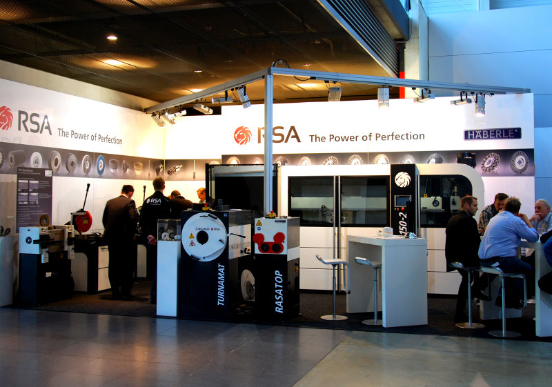 Auch seinen Entgrattechnik-Lösungen räumte RSA auf der Fachmesse AMB breiten Raum ein. So konnten die Besucher die Entgratmaschine Turnamat beim Bearbeiten von schweren, gebogenen Stahlrohren mit starken Graten beobachten. Sie wirkt mit der Hochleistungs-Stahlsäge H 350 der RSA-Marke Häberle sowie mit einer Abfuhrrollenbahn von RSA digitalem Längenmesssystem zusammen. Als dritte Maschine für die Rohrbearbeitung stellte RSA den Rasatop vor eine neue Generation Entgratmaschine mit Innen- und Außensenkern.