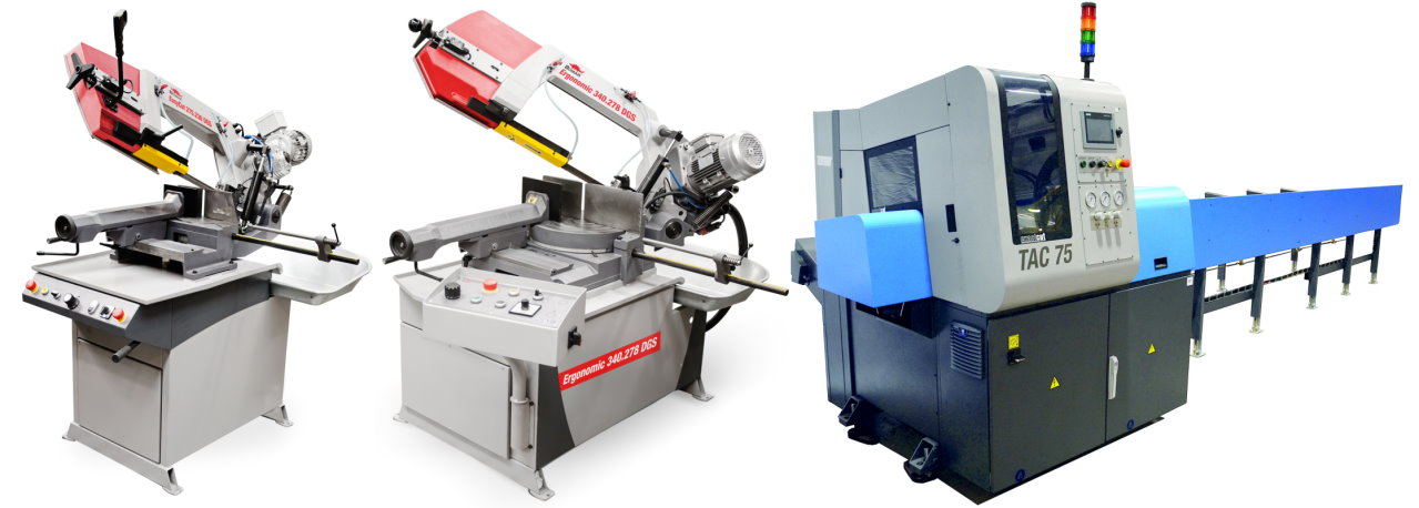 Die Sägen vom Typ Ergonomic kommen seit Jahren als robuste und leistungsfähige Metallbandsägen in den unterschiedlichsten Anwendungsbereichen erfolgreich zum Einsatz. Die Doppelgehrungs-Bandsägen Ergonomic aus der neuen Serie ermöglichen die stufenlose Einstellung für Gehrungsschnitte von rechts 45, links 45 bis rechts 60. Die neuen Serien bieten weitere ergonomische Features. Das Bedienpanel ist schwenkbar an der Vorderseite angebracht und vereint ausnahmslos alle Bedienelemente an einem Platz. Das neue Spannstocksystem erleichtert und beschleunigt die Einstellungen bei einem Materialwechsel. Stufenlose Bandgeschwindigkeiten von 20 bis 120 m/min können über einen Frequenzumformer eingestellt werden. Der Schnittvorschub wird mit Hilfe eines Magnetventils geregelt.