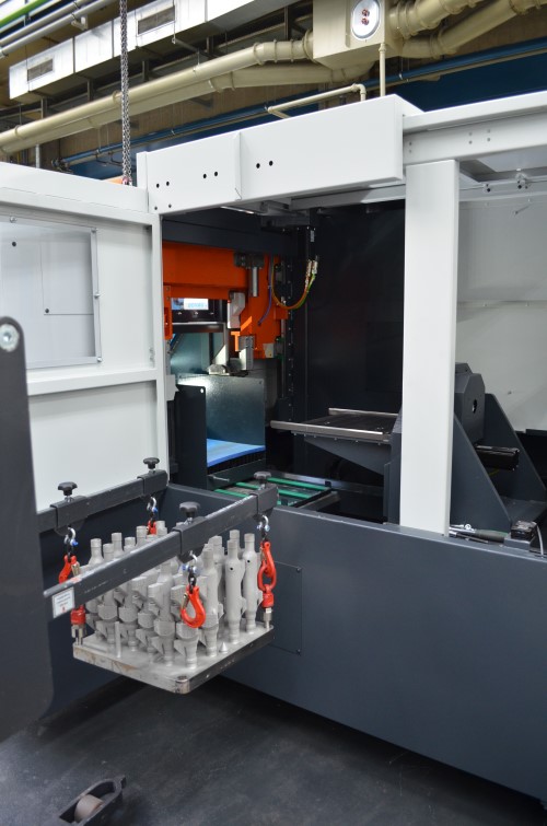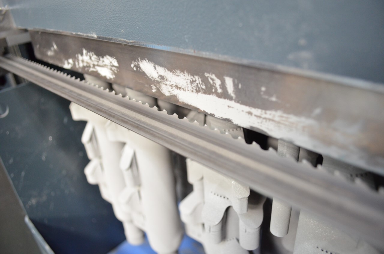 Mithilfe eines elektrischen Hubwagens entnimmt ein Mitarbeiter die bis zu 40 Kilogramm schwere Grundplatte mitsamt den Wellen aus dem 3D-Drucker, transportiert sie zur Säge und platziert sie auf der Einspannvorrichtung. Dort wird die Platte mit dicken Schrauben besonders sicher fixiert und die Maschine verschlossen, damit kein Feinstaub austreten kann. Was als nächstes passiert, ist ungewöhnlich: Die komplette Vorrichtung dreht sich für den Sägevorgang um 180 Grad, die Bauteile werden also kopfüber gesägt. Dieses Konzept ist einzigartig, und es bietet deutliche Vorteile für die additive Fertigung. Die Teile können nach dem Schnitt nicht umstürzen oder einknicken das vermeidet Beschädigungen, die zu aufwändigen Nacharbeiten oder sogar teurer Ausschussware führen können.