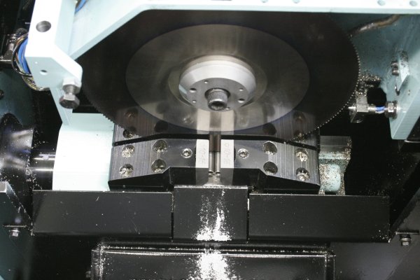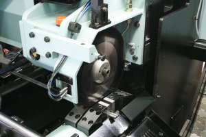 Eine wichtige Neuentwicklung im Zuge dieser Maßnahmen ist ein elektromotorisch betriebener Spannstock, der automatisch die optimalen Haltekräfte bezogen auf das jeweilige Werkstück "ertastet". Sein zentrischer Spannvorgang unter der Mittelachse des Sägeblattes mit 350 mm Durchmesser ermöglicht eine lineare Sägegeometrie und optimiert und minimiert so den Zerspanungsweg. Bis zur Außenkontur der Rohrlage bewegen sich die Spannbacken dabei im Eilgang. Anschließend bauen sie im Schleichgang eine vorgestimmte Kraft auf, die das Teil sicher spannt, ohne es dabei zu verformen. Die Größe dieser Spannkraft muss nicht eingestellt werden und wird in der Maschinensteuerung gespeichert. Bei den weiteren Sägevorgängen ist dann nur noch ein minimaler und damit schneller Spannbackenhub notwendig, um ein zuverlässiges Spannen zu bewerkstelligen.