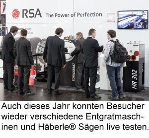 Auch dieses Jahr präsentierte RSA auf der Tube wieder verschiedene Entgratmaschinen und Sägen der Marke Häberle, die Besucher live testen konnten. Unser Ziel ist, mit Praktikern aus der Vorfertigung intensive Bera-tungsgespräche rund um das Thema Sägen und Entgraten zu führen, äußerte sich Heiko Krenn, Verkaufsleiter der RSA cutting systems GmbH. Die direkte Verbindung von Entgrat-Systemen mit vorgeschalteten Häberle Sägen führt zu verkürzten Durchlaufzeiten. Parallel dazu sind für unsere Kunden Entgrat-methoden wichtig, die unabhängig von der Qualifikation des Bedieners sind, so Heiko Krenn weiter.