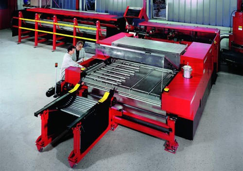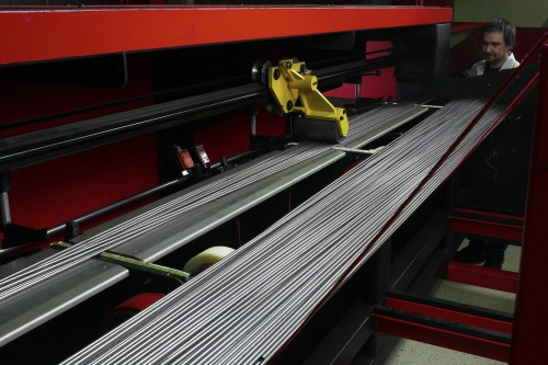Patentieren ließ sich RSA ein Vereinzelungs-System in Verbindung mit dem Bundlader. Und das funktioniert so: Die Rohre werden aus dem Bundlader herausgehoben. Vulkolanummantelte Mitnehmerketten transportieren die Werkstücke auf einen Tisch. Hier läuft eine Walze über die verschränkt liegenden Rohre und richtet sie achsparallel aus. Anschließend werden sie geordnet in einen Puffer transportiert, aus dem Einwerfer die Stangen vereinzeln und der Säge zuführen.